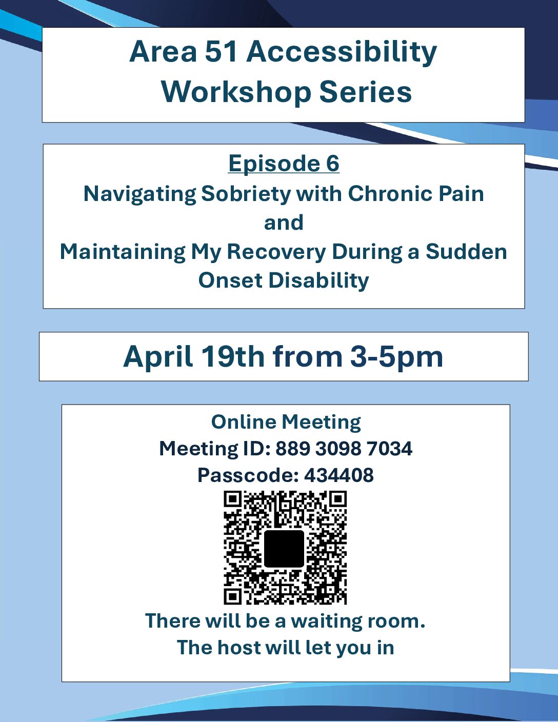 Area 51 Accessibility Workshop Series Episode 6 Navigating Sobriety with Chronic Pain and Maintaining My Recovery During a Sudden Onset Disability April 19th from 3-5pm Online Meeting Meeting ID: 889 3098 7034 Passcode: 434408 There will be a waiting room. The host will let you in.