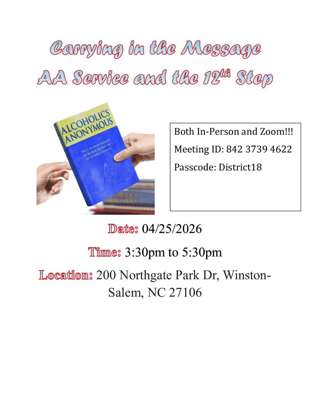 Intergroup Office 208 Northgate Park Drive, Winston Salem, NC, United StatesCarrying in the Message AA Service and the 12th Step Both In-Person and Zoom!!! Meeting ID: 842 3739 4622 Passcode: District18 Date: 04/25/2026 Time: 3:30pm to 5:30pm Location: 200 Northgate Park Dr, WinstonSalem, NC 27106